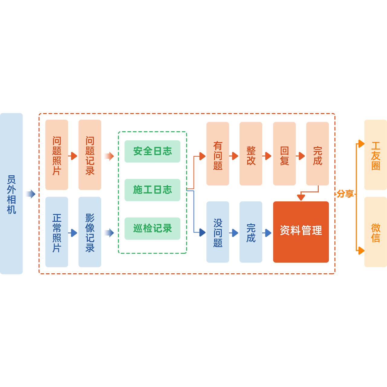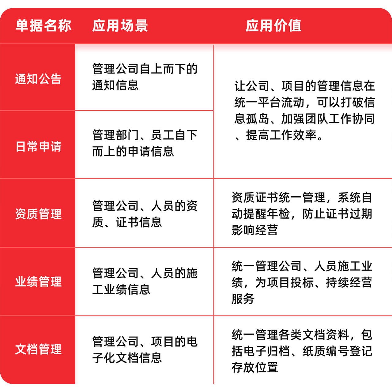 1、加强质量管理:通过施工日志、检查整改等单据设计与应用,加强质量管理,防止项目因质量问题产生返工损失; 2、强化安全管理:通过安全教育、安全交底、安全巡检等单据设计与应用,加强安全管理,控制安全风险; 3、加强资料管理:通过员外相机的设计与应用及影像资料、过程资料的保存,为项目决算收集资料,防止结算损失。