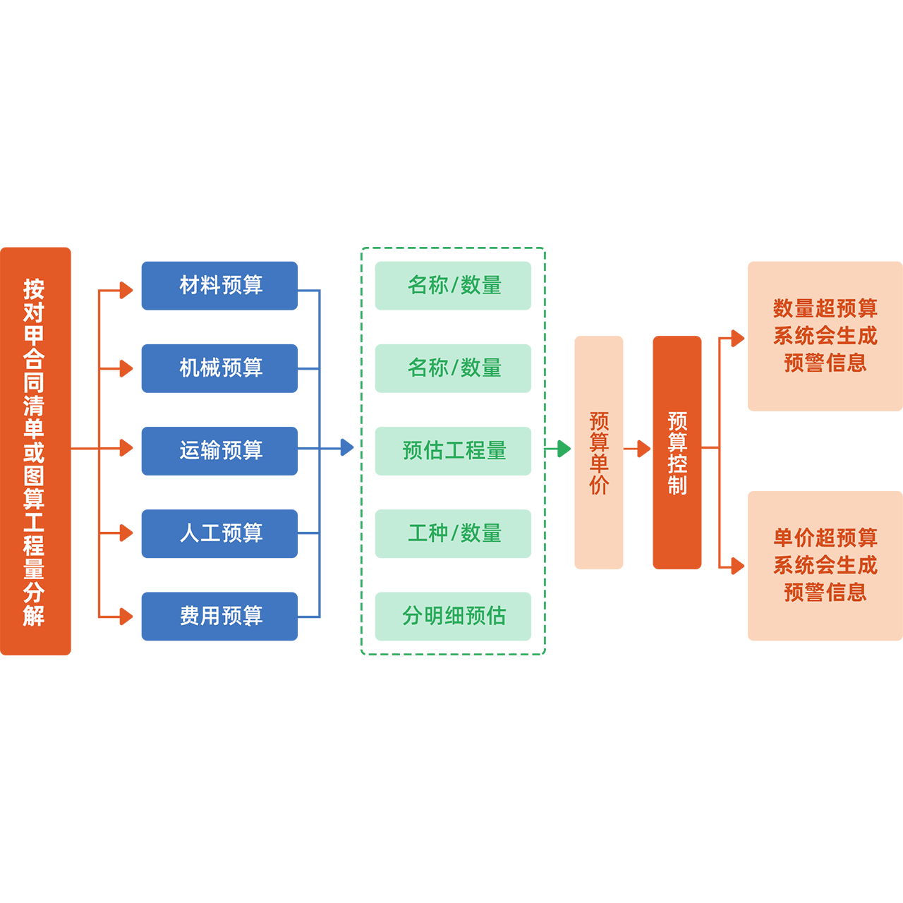 1、预警功能:当要素成本的实际数量、单价、金额超过预算时,系统会生成预警信息; 2、考核功能:公司可与项目部共同制定项目预算,并可以此作为目标成本,用来考核项目团队;加强正向激励,提高团队积极性。