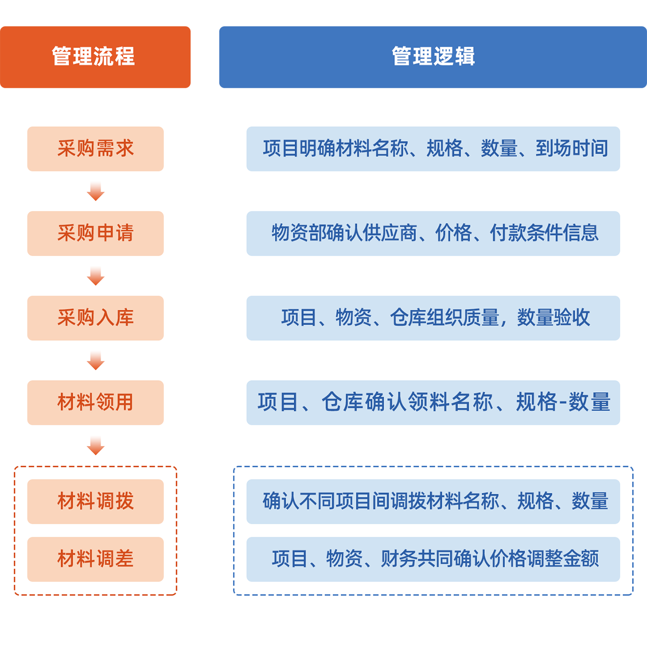 1、规范管理流程:从采购需求、采购申请到材料出入库业务,按流程办理,助力项目规范管理流程; 2、控制材料成本:保证材料按需采购,加强现场材料及库存管理,杜绝浪费,控制材料成本; 3、确保数据质量:强化过程管理,及时准确记录材料采购及领用信息,确保材料成本数据质量。
