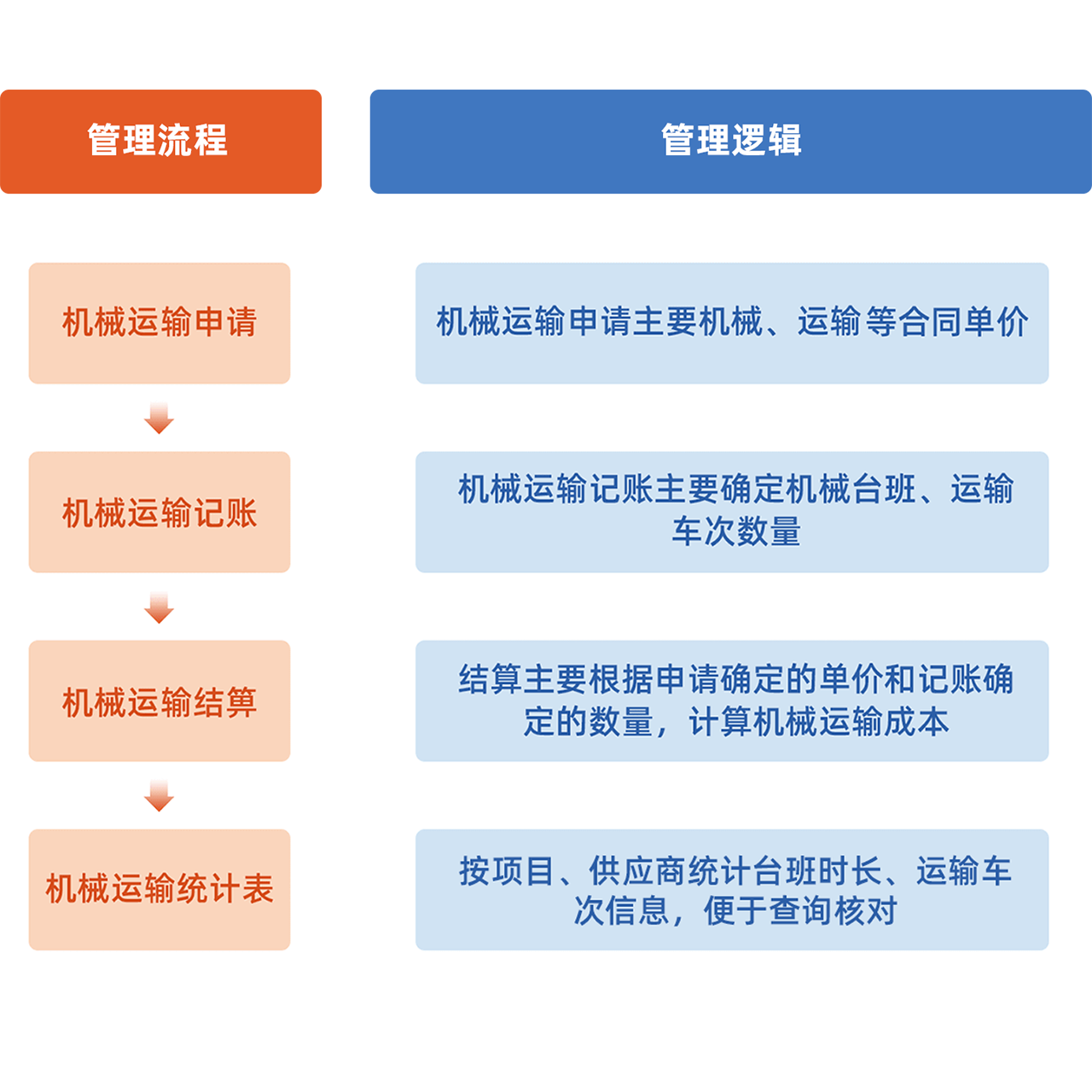 1、规范机械运输管理流程:事前申请确认单价、事中记录确认数量,按期结算确认成本,助力项目形成规范的管理流程;2、确保数据质量:强化过程管理,防止数量信息造假舞弊,确保机械运输成本数据质量。