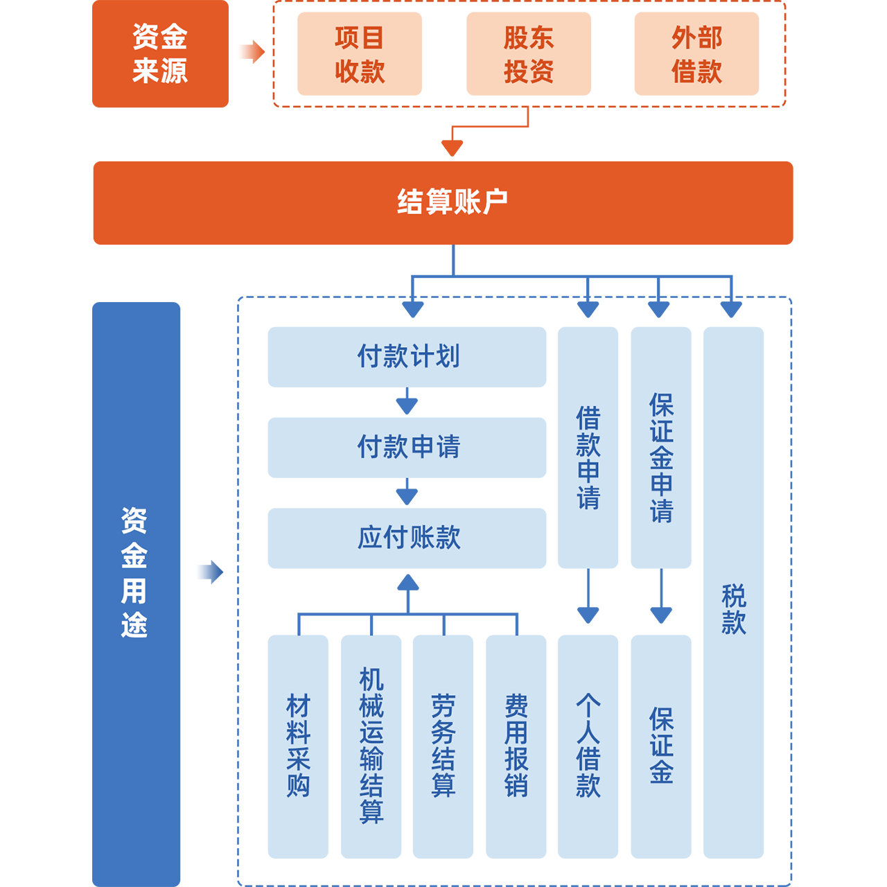 1、资金管理应用价值:从资金来源、资金用途两个纬度管理并核算资金收支业务,做好资金计划,确保资金收支平衡、受控; 2、往来管理应用价值:通过加强应收款催收、应付款的合理安排,以及付款计划、付款申请等流程管理,有效管理往来账款。