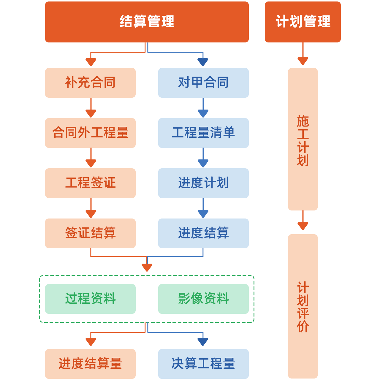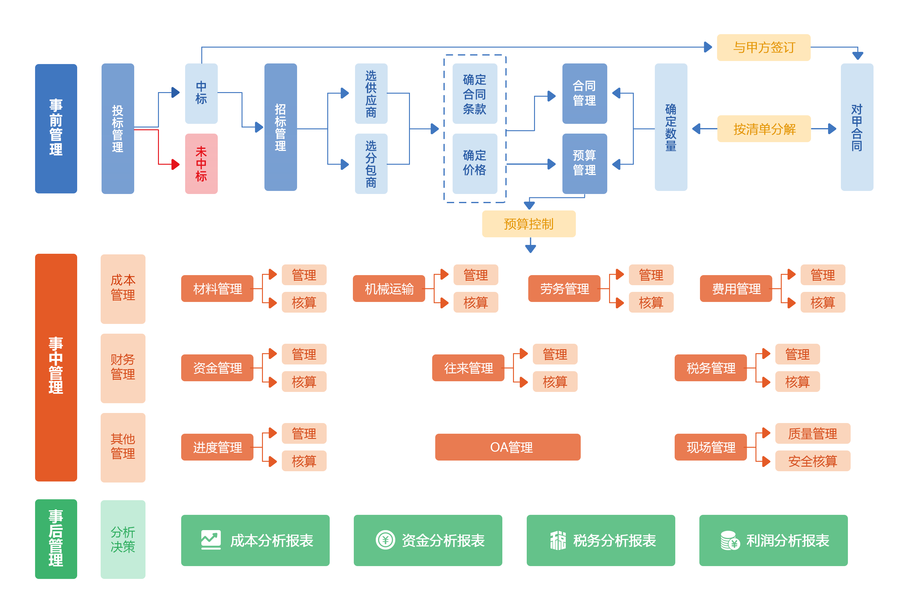 加强合同管理,通过签订规范的合同文件,使项目减少不必要的纠纷;规范材料、机械、人工、费用等成本要素的归集与核算;加强工程进度的量化管理与项目产值的核算;强化现场管理,规范留存施工、安全影像资料;规范资金管理及往来核算,确保内外账目清晰;规范税务管理,减少项目纳税风险。